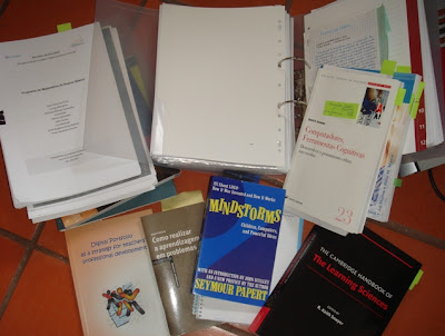E lá voltarei depois (à cama :)... para continuar a tentar pôr as ideias em ordem... ler/consultar várias coisas ao mesmo tempo... pousar os livros e passar ao registo de mais uns tópicos. Em busca de algo, mas ainda com dificuldade em fechar o campo... em arrumar mesmo bem arrumadinha a ideia principal (o que não conseguir sozinha, ficará para o orientador que tiver de ter a paciência de me aturar... eu é que não consigo levar-me a mim, sem ideia nenhuma agarrada aos sapatos... até porque o que penso fazer tem de ser já começado com os alunos.)