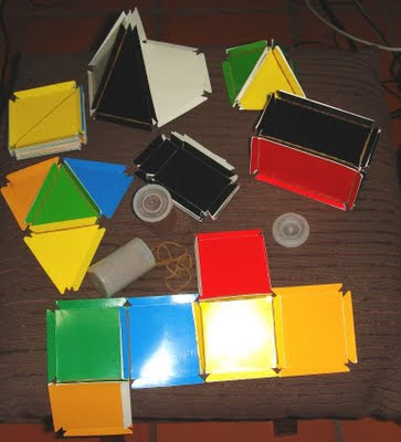 Sei que a ideia nasceu num qualquer manual longínquo, mas não me lembro qual. Usei os modelos e construí um kit em cartolina para os alunos poderem manusear, sobretudo durante as unidades mais directamente relacionadas com a geometria. Lembro-me da designação: sólidos com abas. Simples. temos as faces dos poliedros rodeadas de umas pequenas abas que servem de suporte aos elásticos na construção dos sólidos. Com eles descobrimos as planificações do cubo (e de todos os sólidos que integram o kit). Com eles estudamos os elementos dos sólidos, descobrimos relações entre eles. Aprendemos as designações e a sua lógica... podemos falar de área, do perímetro... podemos explorar muitos outros conteúdos.